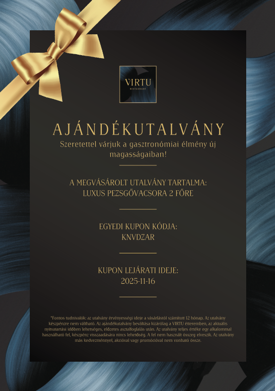 Emelje az ajándékozás élményét új szintre a VIRTU Restaurant exkluzív ajándékutalványával, amelyet mostantól személyre szabott üzenettel is különlegessé tehet. Válassza ki az elegáns alap- vagy a varázslatos karácsonyi dizájnt, adjon hozzá egy szívhez szóló üzenetet, és lepje meg szeretteit egy felejthetetlen gasztronómiai élménnyel!