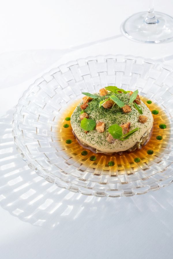 The bold, smoky aroma of roasted eggplant takes center stage in this plant-based fine-dining appetizer. The carefully roasted eggplant is tossed with a parsley and arugula pesto, giving the dish a fresh, herbal character.