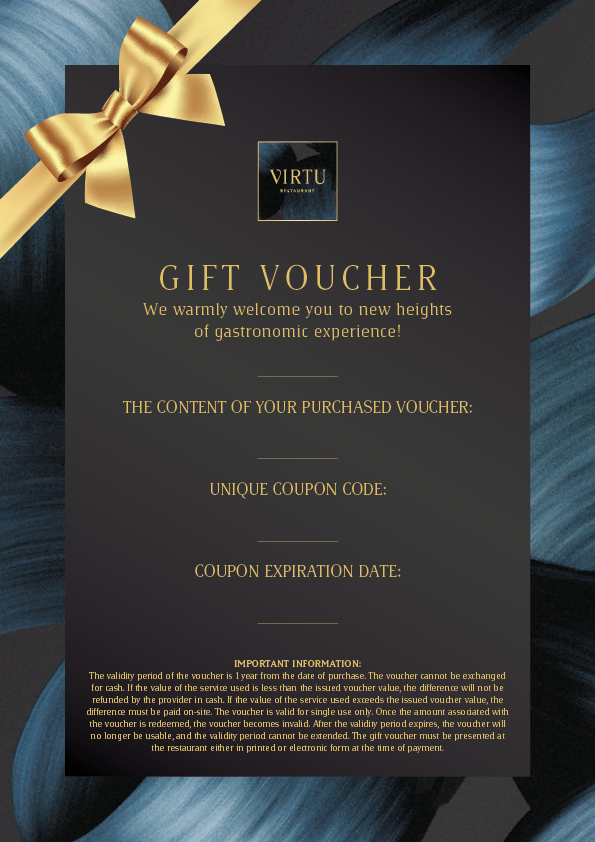 Elevate the joy of giving to a whole new level with the exclusive VIRTU Restaurant gift voucher. Now, you can make it even more special by adding a personalized message. Select the design that suits your taste, add a heartfelt message, and surprise your loved ones with an unforgettable gastronomic experience!