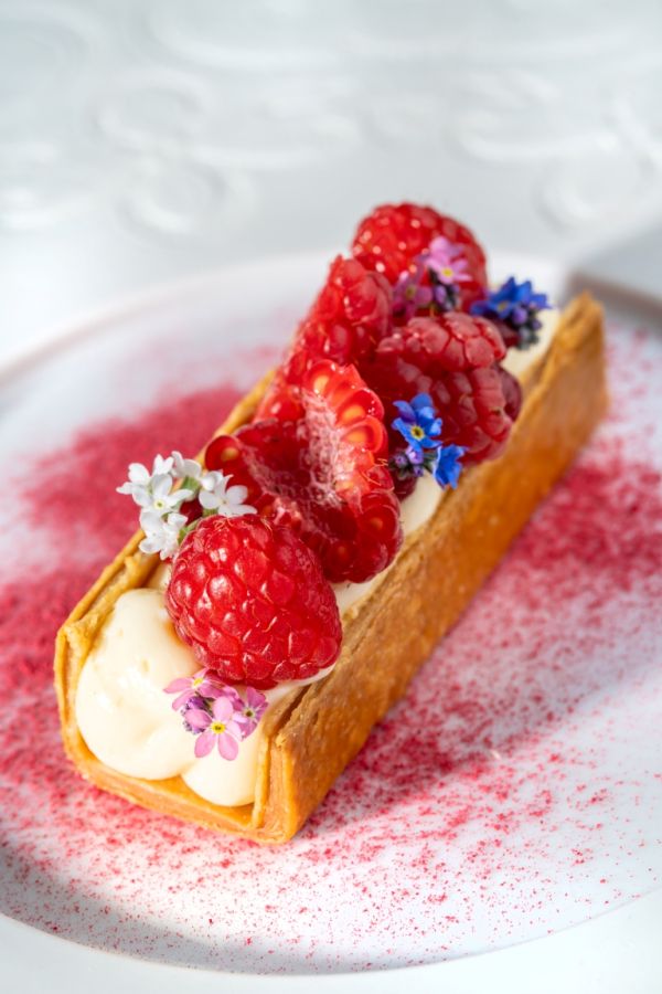 Multi-layered, buttery homemade puff pastry with silky Diplomat cream. Topped with fresh raspberry cream and served with a caramelized white chocolate sauce.