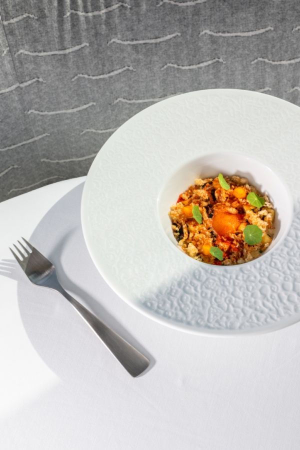 At the center of the composition lies a silky sous-vide egg yolk cream, adding richness and depth to the potato base. The result is a dish that beautifully bridges traditional Hungarian comfort food and modern fine dining techniques, highlighting seasonal ingredients with elegance and precision.