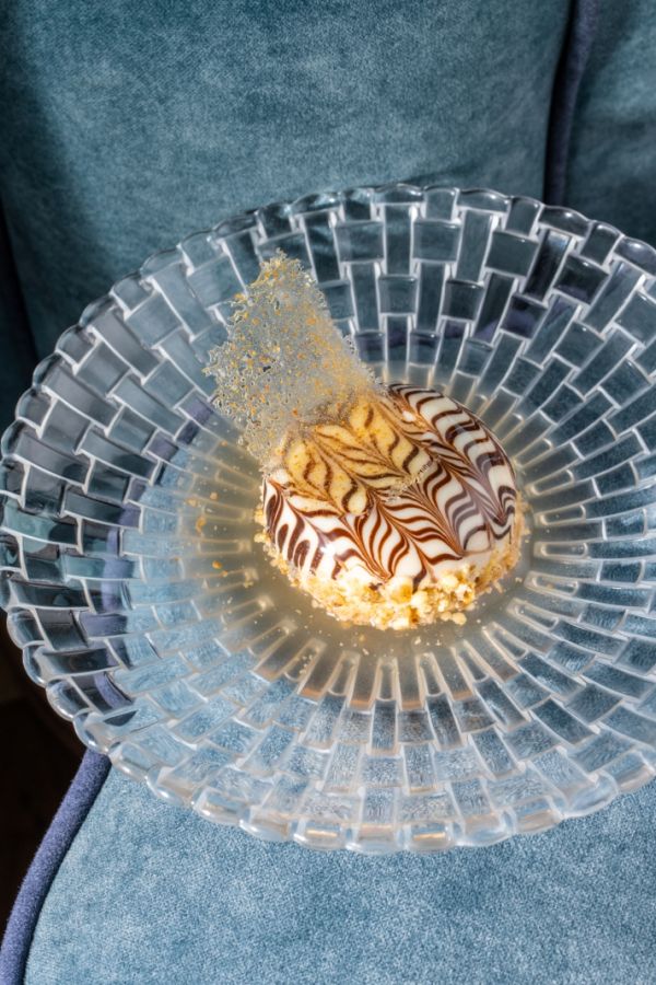 A magyar cukrászat ikonikus desszertje jelenik meg kortárs tálalásban. A klasszikus Eszterházy torta dióval készült piskótarétegei és selymes krémje elegáns alapot adnak a fogásnak.