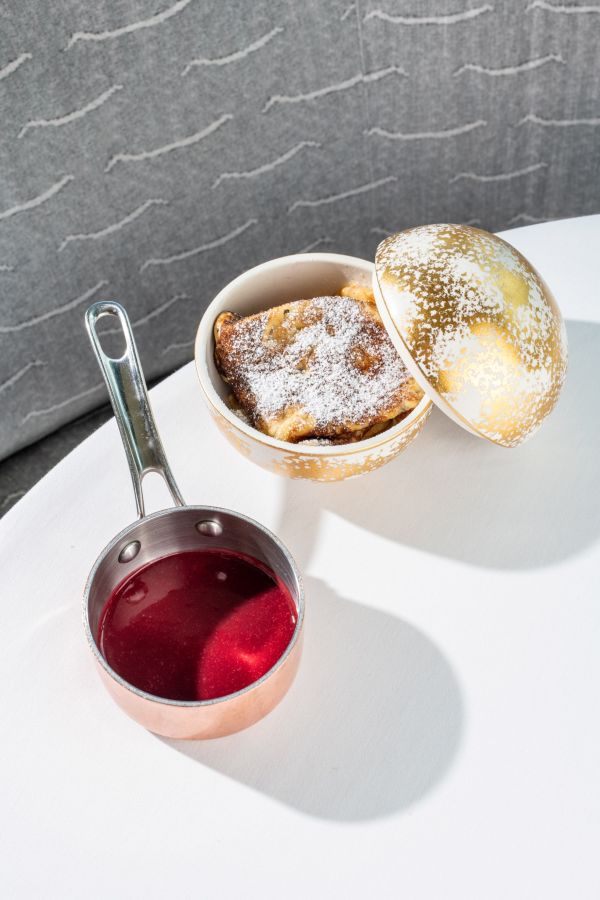 A pirított palacsintát tálalás előtt málnalikőrrel készült szirupban forgatjuk meg, majd a túrós-málnás kompozícióra helyezzük, és végül finom porcukorral hintjük meg. Az eredmény egy meglepően könnyed, mégis rétegzett ízvilágú desszert, amely tökéletesen zár egy fine dining vacsorát.