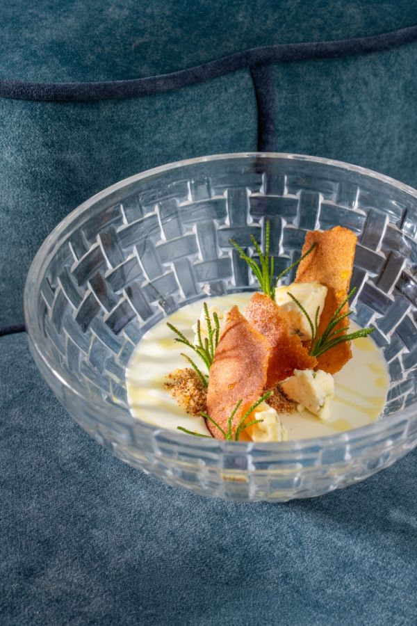 A pannacotta tetejére friss kéksajt darabok kerülnek, amelyek tovább erősítik az étel gazdag, umamiban gazdag karakterét. A textúrák játékát rozskenyér morzsa és ropogós rozskenyér-kriszpi teszi teljessé.