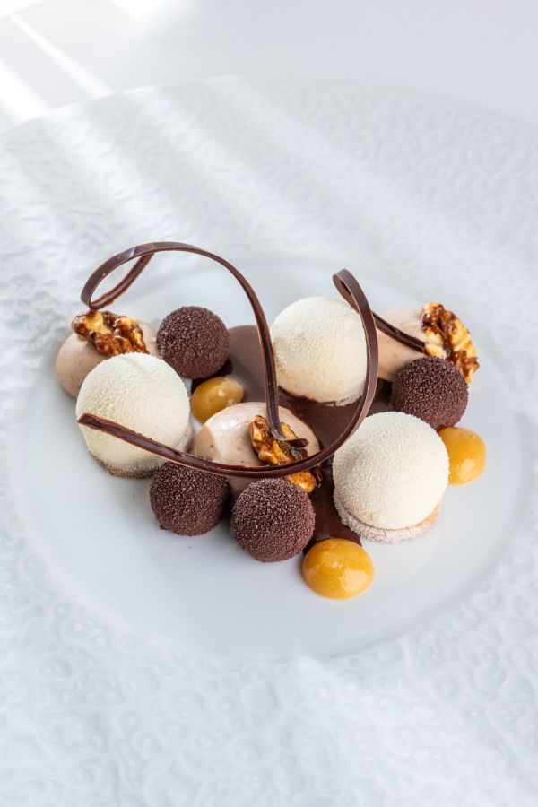 A vaníliás krémgömbök a somlói galuska lágy főzött krémjét idézik, amelyek diós sablé alapon nyugszanak, és finom fehércsokoládé-bevonatot kapnak. A másik elem az étcsokoládé mousse verziója, szintén diós sabléval – így a csokoládé és dió harmonikus találkozása új formát ölt. A tányért kiegészíti egy aranymazsolakrém, kandírozott dió, valamint egy selymes csokoládészósz, amelyet a vendég előtt tálalunk.