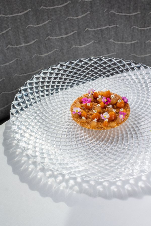 A fogás tetejére egy diós tuile (vékony, ropogós díszelem) kerül, amelyet kakaóporral és enyhe fűszerekkel ízesítünk, ezzel földes, ropogós ellenpontot adva a lágy májkrémhez. A tokaji aszú zselé, amely 5 meleg karakterű fűszer (pl. csillagánizs, szegfűszeg, fahéj) keverékével van ízesítve, édes-savanykás karakterével egyensúlyba hozza az étel zsírosságát, miközben szezonokon átívelő hangulatot teremt.