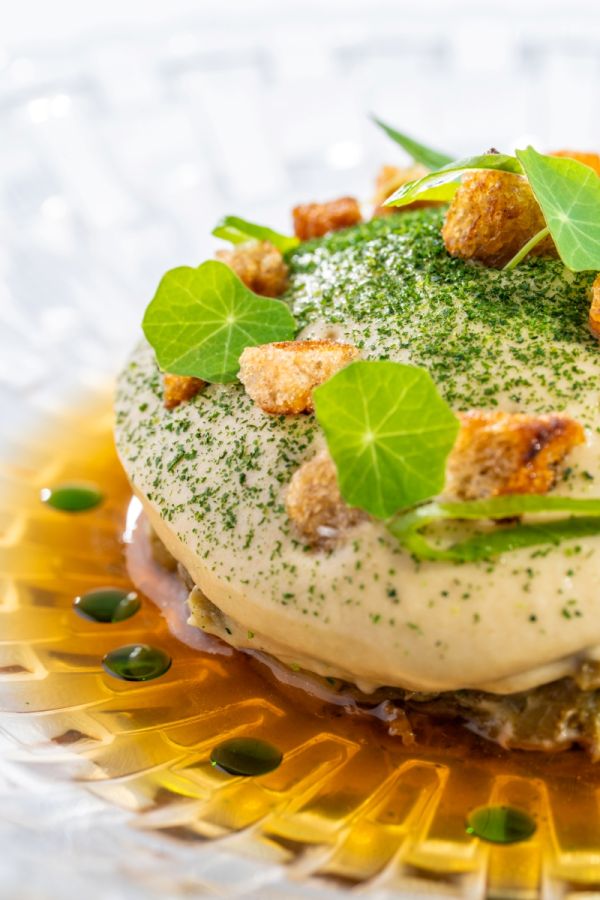 A sült padlizsán karakteres, füstös aromája kerül a fogás középpontjába, amely egy elegáns, zöldségalapú fine dining előételben jelenik meg. A gondosan megsütött padlizsánt falatokra vágják, majd petrezselymes és rukkolás pestóval forgatják össze, amely friss, zöldfűszeres karaktert ad az ételnek.