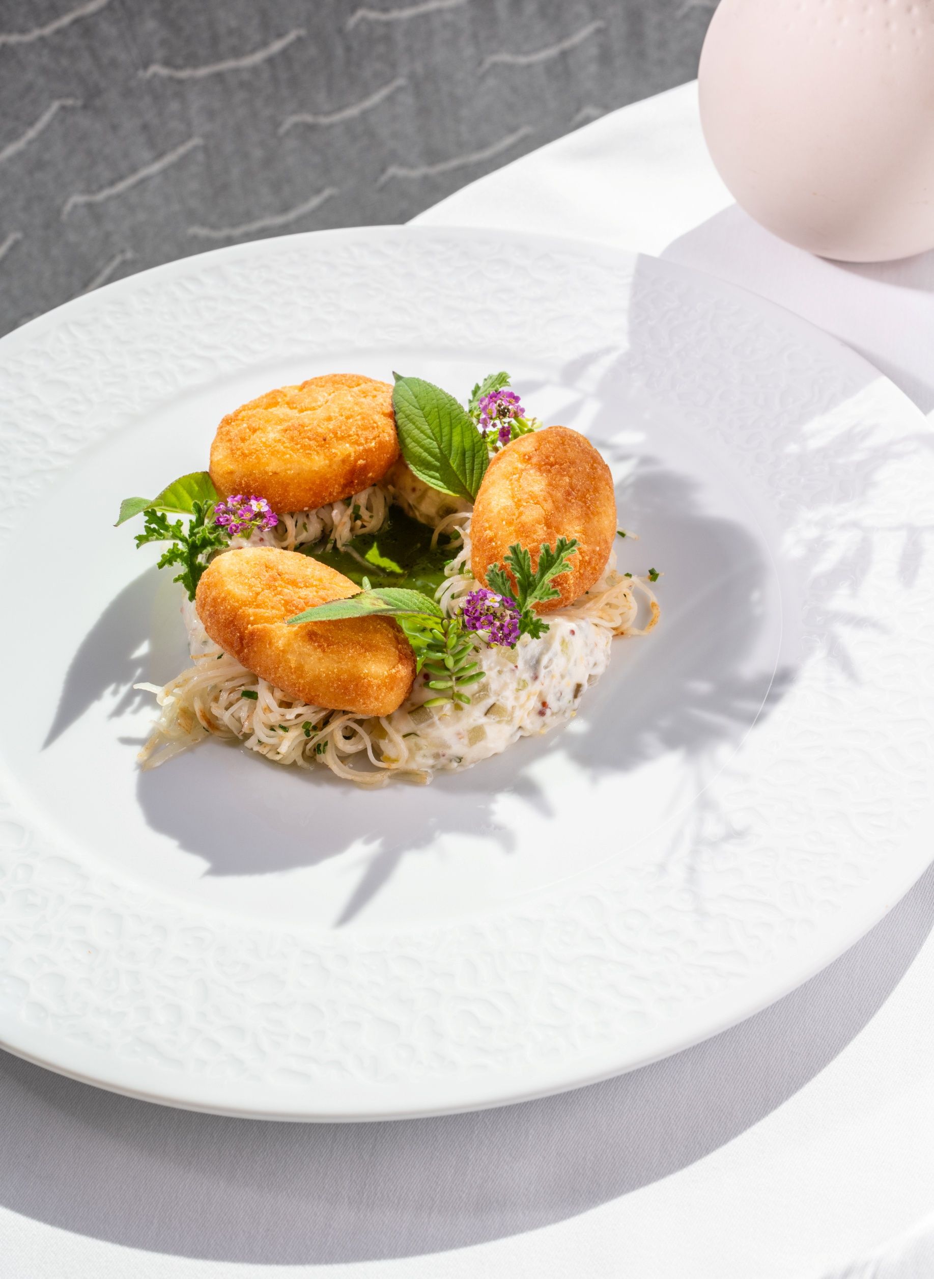 A fogás középpontjában egy egészben sült zeller áll, amelyet puhára konfitálunk, majd formára vágva, gluténmentes panírba forgatva ropogósra sütünk. A pécsi bundázás technikája miatt a zeller kívül aranybarna és ropogós, belül pedig krémesen puha – olyan textúrát nyújt, ami a húsfogyasztás élményét idézi, miközben teljesen növényi marad.