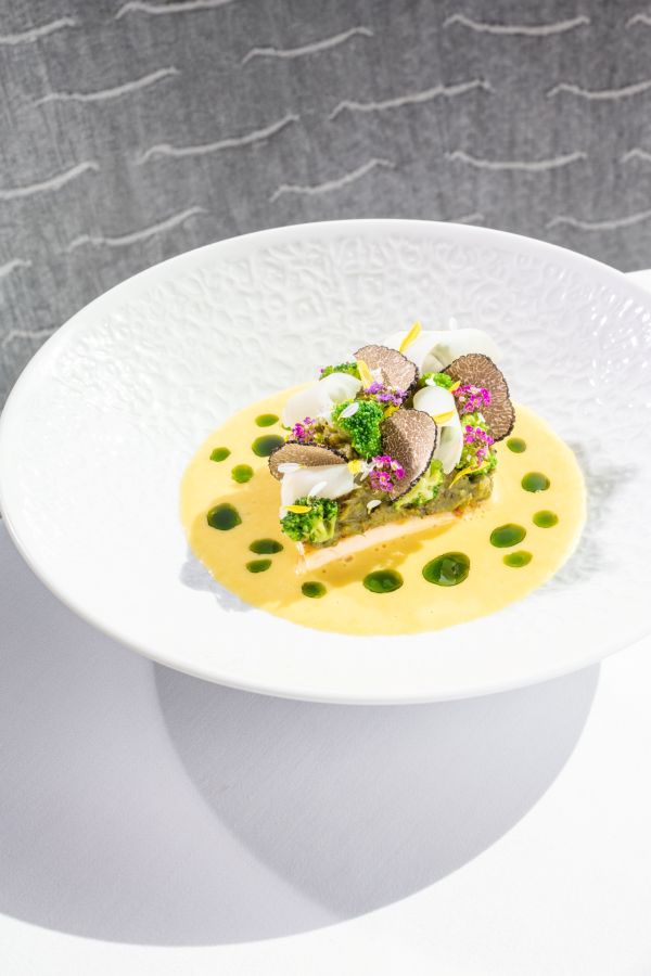 A hús mellé sült brokkoli kerül, amelyet szárazon, magas hőfokon lepirítunk. Ezt összekeverjük pirított tökmaggal, friss petrezselyemszárral és tálaláskor brokkolikrémmel gazdagítjuk. Ez a földes, enyhén édeskés kísérő tökéletes kontrasztot alkot a hús sós-pörkölt karakterével. A csirke tetejére savanyított brokkoliszár, frissen reszelt szarvasgomba és enyhén pirított gyöngyhagyma kerül.