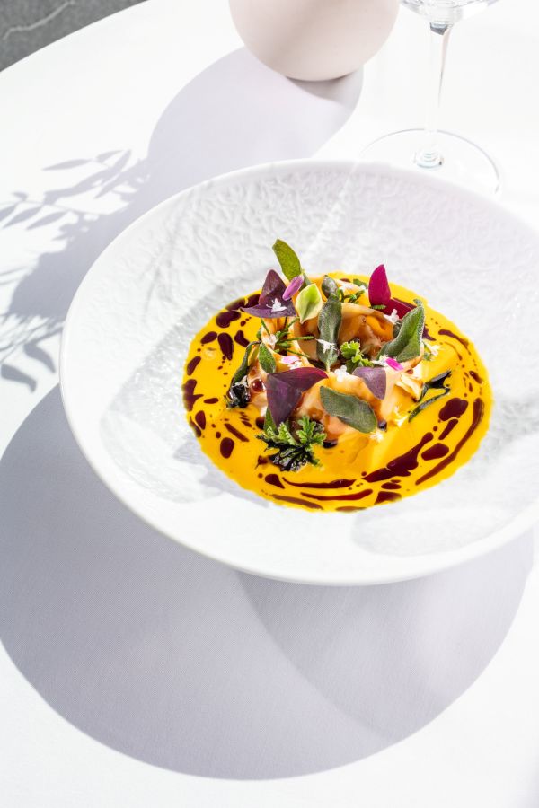 Tálaláskor a tészta mellé egy sütőtökből készült, bársonyos velouté kerül, amelyet egy csipet pikáns savasság tesz frissé és modernné. Az ételt őrölt, pirított őrségi tökmagolaj koronázza meg, amely földes jegyeivel emeli ki az étel őszi karakterét. A ropogósra sütött friss zsályalevél nemcsak vizuális, hanem ízbeli ellenpontot is ad: aromás, enyhén kesernyés karakterével tökéletes kontrasztot képez a krémes elemekkel.
