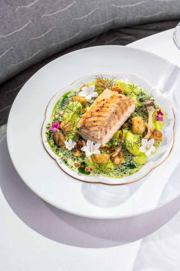 A tengeri hangulatot a tálalás során tengeri spárga fokozza, ami sós, ropogós kiegészítőként jelenik meg, és még tovább mélyíti a halétel tengeri karakterét. A fogás opcionálisan 10 g tokhal kaviárral is kérhető – így válik teljessé ez a különleges, magyar alapanyagokra épülő fine dining halétel.