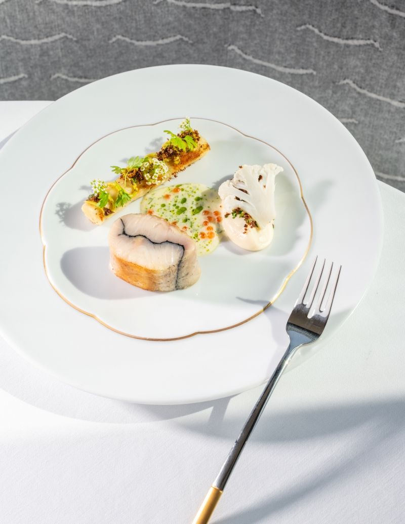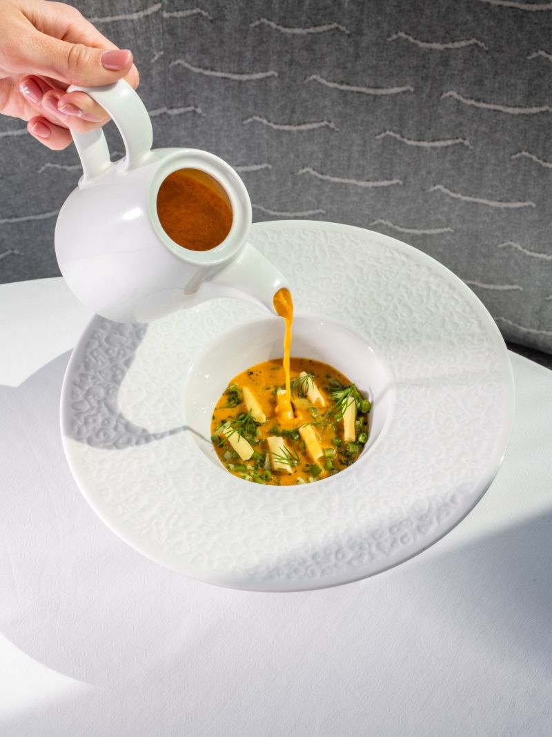 A tányéron pörkölt arabica kávéból készült kávéolaj jelenik meg cseppek formájában, amely meglepő mélységet és enyhén pörkölt aromát ad az ételnek. Ez a modern fine dining leves friss, könnyed és rendkívül aromatikus kezdése egy gasztronómiai menüsornak.
