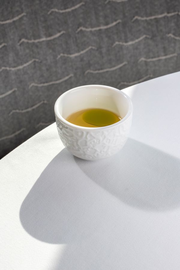 A második elem egy kis csészében kínált átlátszó paradicsomvíz, amely nem keverendő össze egy hagyományos paradicsomlével. Ez a kivonatolt lé a friss, lédús paradicsom tisztított „esszenciája”, amelybe házi készítésű bazsalikomecet és egy csepp petrezselyemolaj kerül. A pohár tetején friss zöldfűszer-díszítés zárja a kompozíciót.