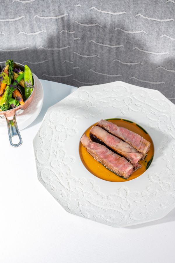 Wagyu rib-eye sült zöldségekkel és pecsenyelével